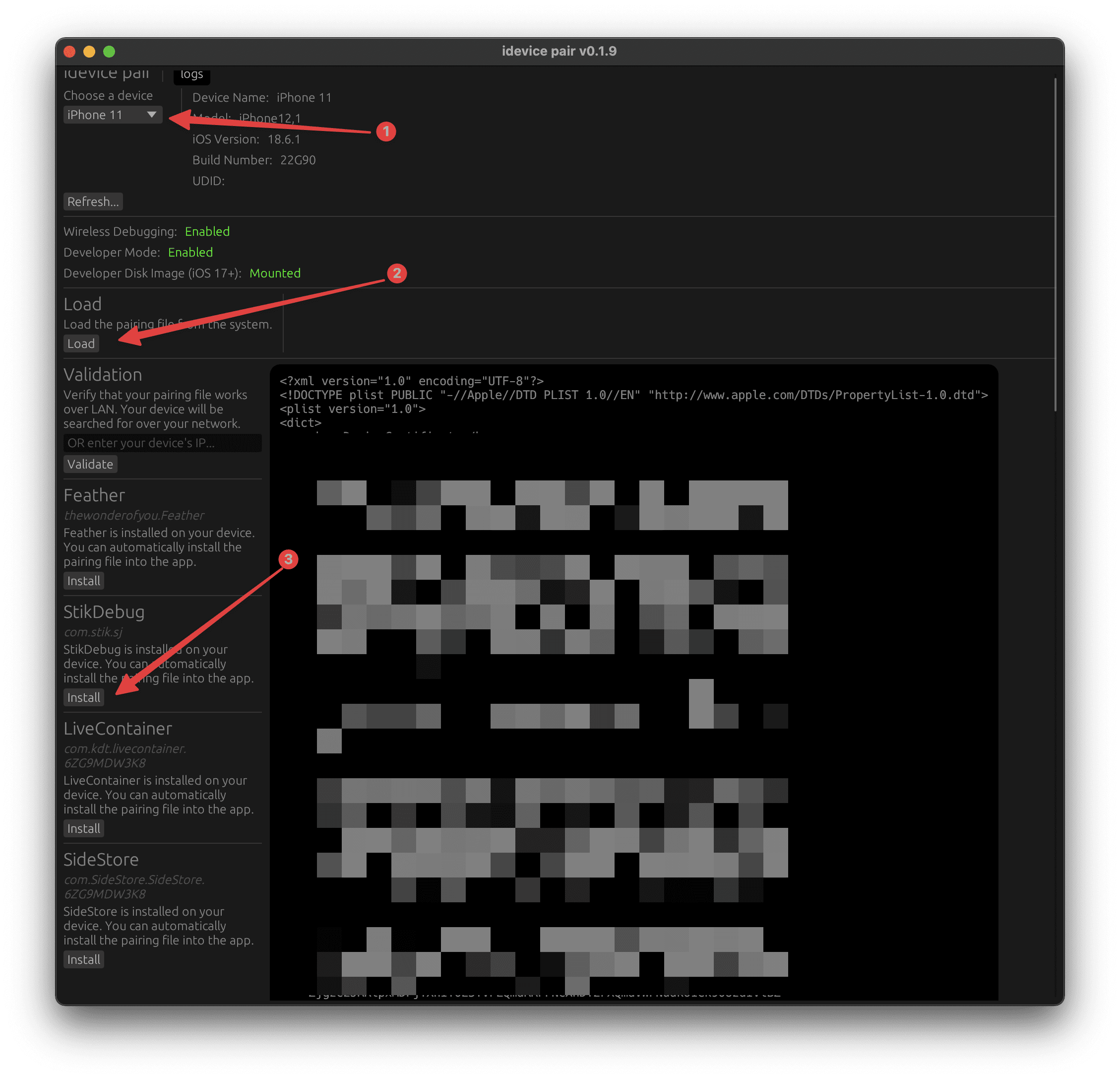 Sau khi ghép nối với StikDebug xong kiểm tra lại nếu dòng Pairing file hiện màu xanh là ok, nếu báo success trong idevice_pair mà trong StikDebug vẫn không xanh thì các bạn có thể copy toàn bộ cái phần <?xml…. đến cuối cùng </plist> và lưu thành file .plist để nhập vào trong StikDebug.